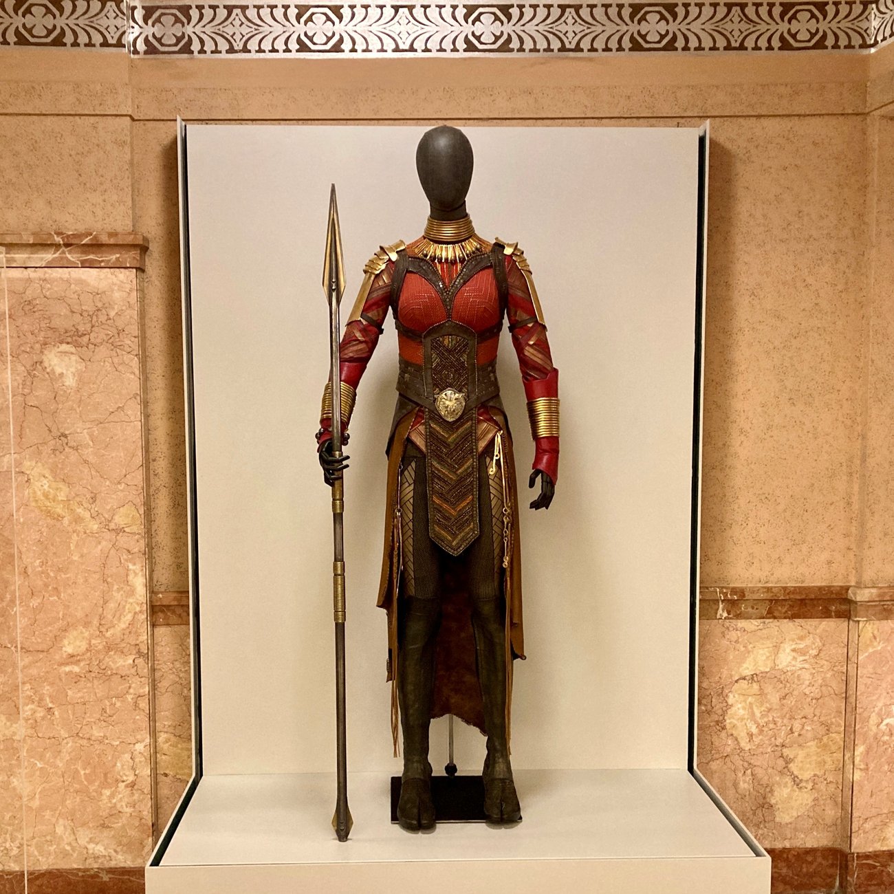 The costumes worn by Black Panther (Chadwick Boseman), Erik Killmonger (Michael B. Jordan), Okoye (Danai Gurira), and Queen Ramonda (Angela Bassett) will be available for public viewing in Smith Lobby at Severance Music Center from February 19 through April 6. Costume designer Ruth E. Carter incorporated elements from different African tribes to create the garments, which earned her the Academy Award for best costume design in 2019.